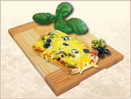 110g vorgebacken, Tomatencreme, Olivenringe grün/schwarz, Käse