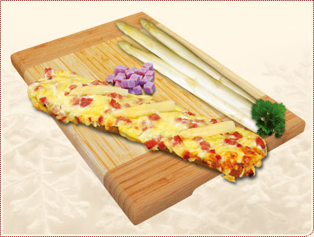 150g vorgebacken, Sauerrahm, Mehrkornbaguette, Spargel, Kochschinkenwürfel, Käse